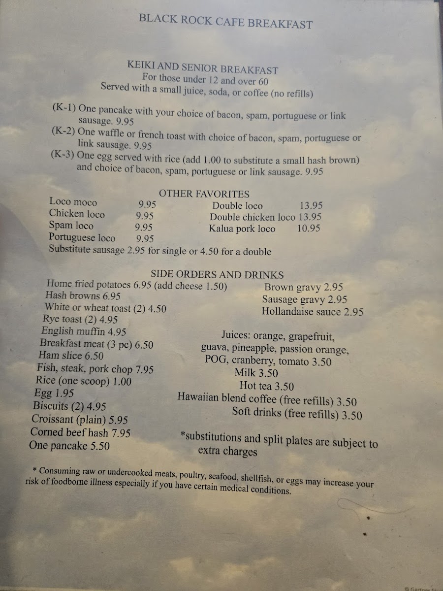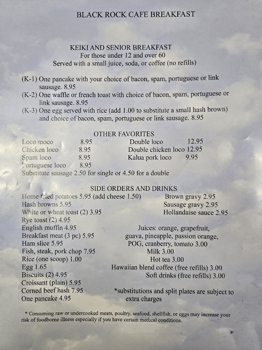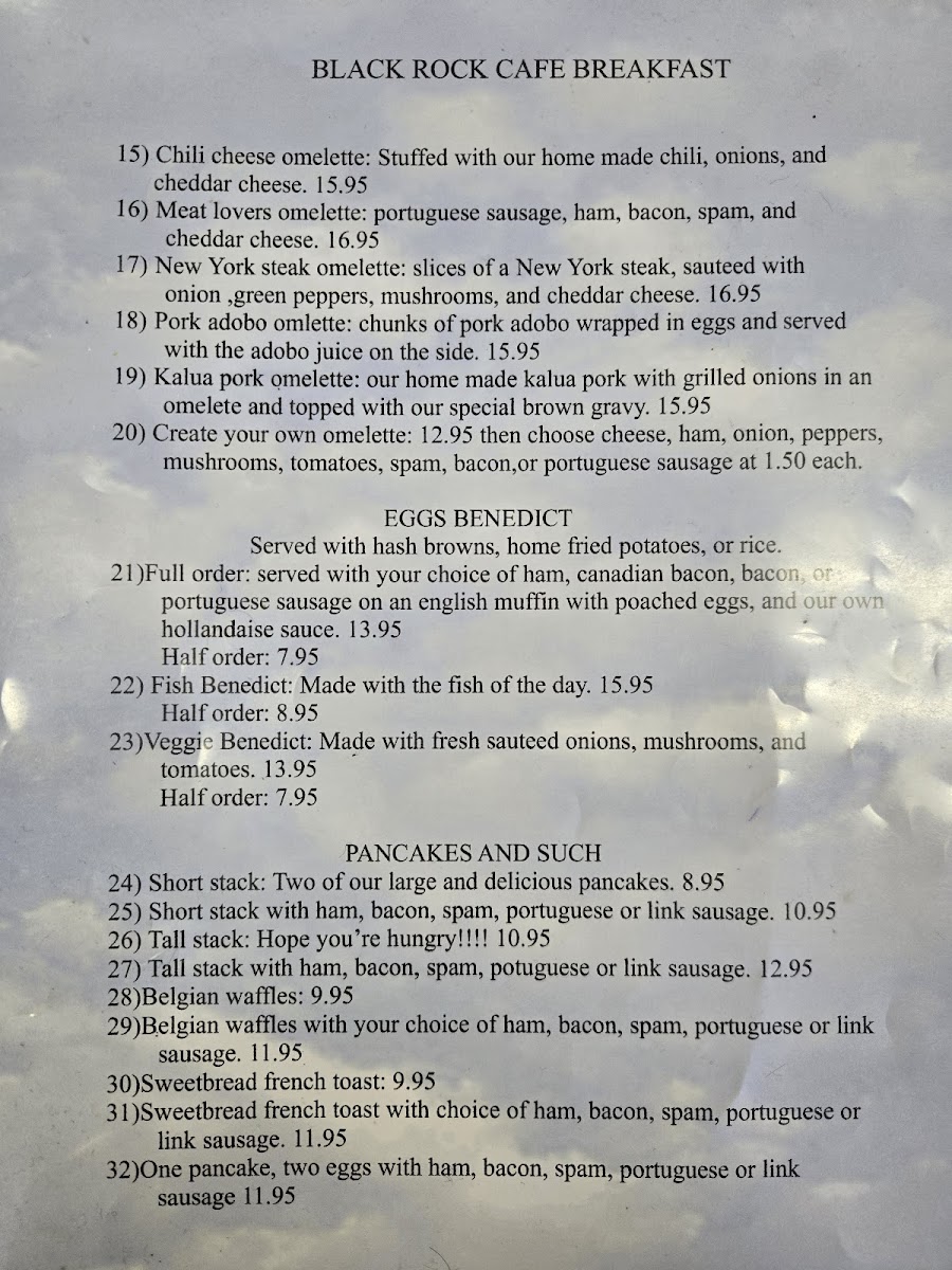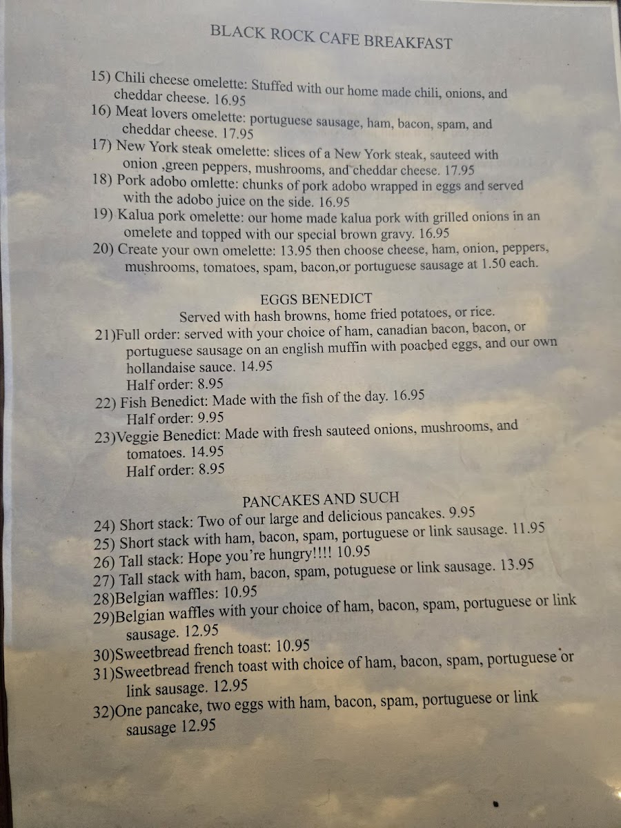 Black Rock Cafe offers a menu that feels like a comforting embrace of classic American fare with a touch of local Hawaiian flavor. The selection is approachable and well-suited for any time of day, whether you’re settling in for a hearty breakfast, a satisfying lunch, or a relaxed dinner. Expect familiar favorites alongside some distinctive dishes that capture the island’s spirit, making each meal feel down-to-earth and welcoming.