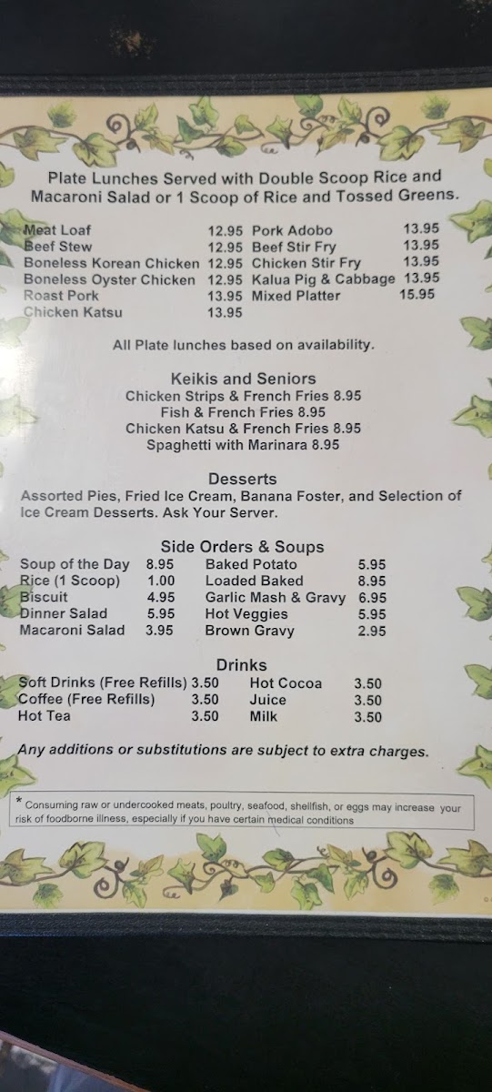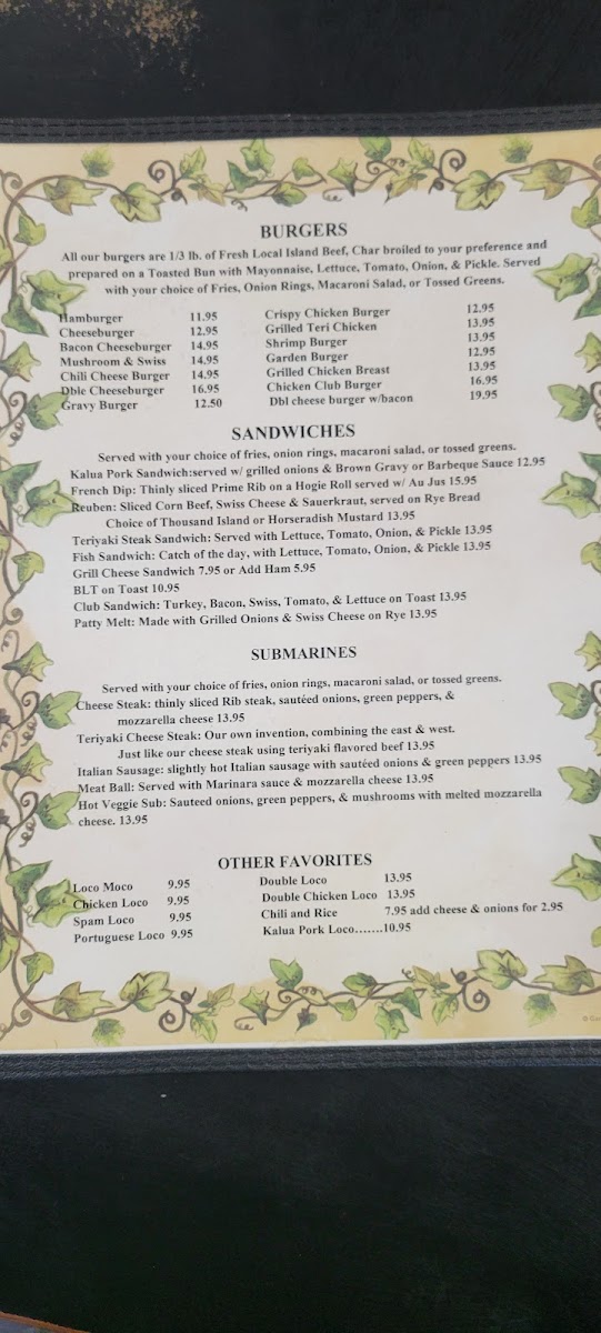 Breakfast here often draws visitors with generous portions like eggs benedict served with flavorful potatoes, stacks of pancakes large enough to share, and inventive omelets that include local ingredients such as Spam or adobo pork. Lunch and dinner bring a variety of options ranging from tender baby back ribs and chicken katsu to freshly grilled fish and inventive sandwiches like the teriyaki cheese steak sub or ono fish combo.